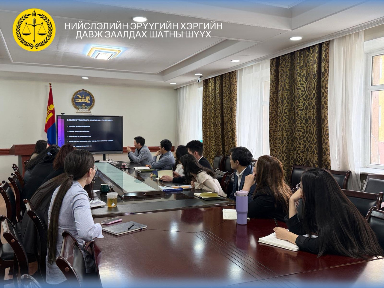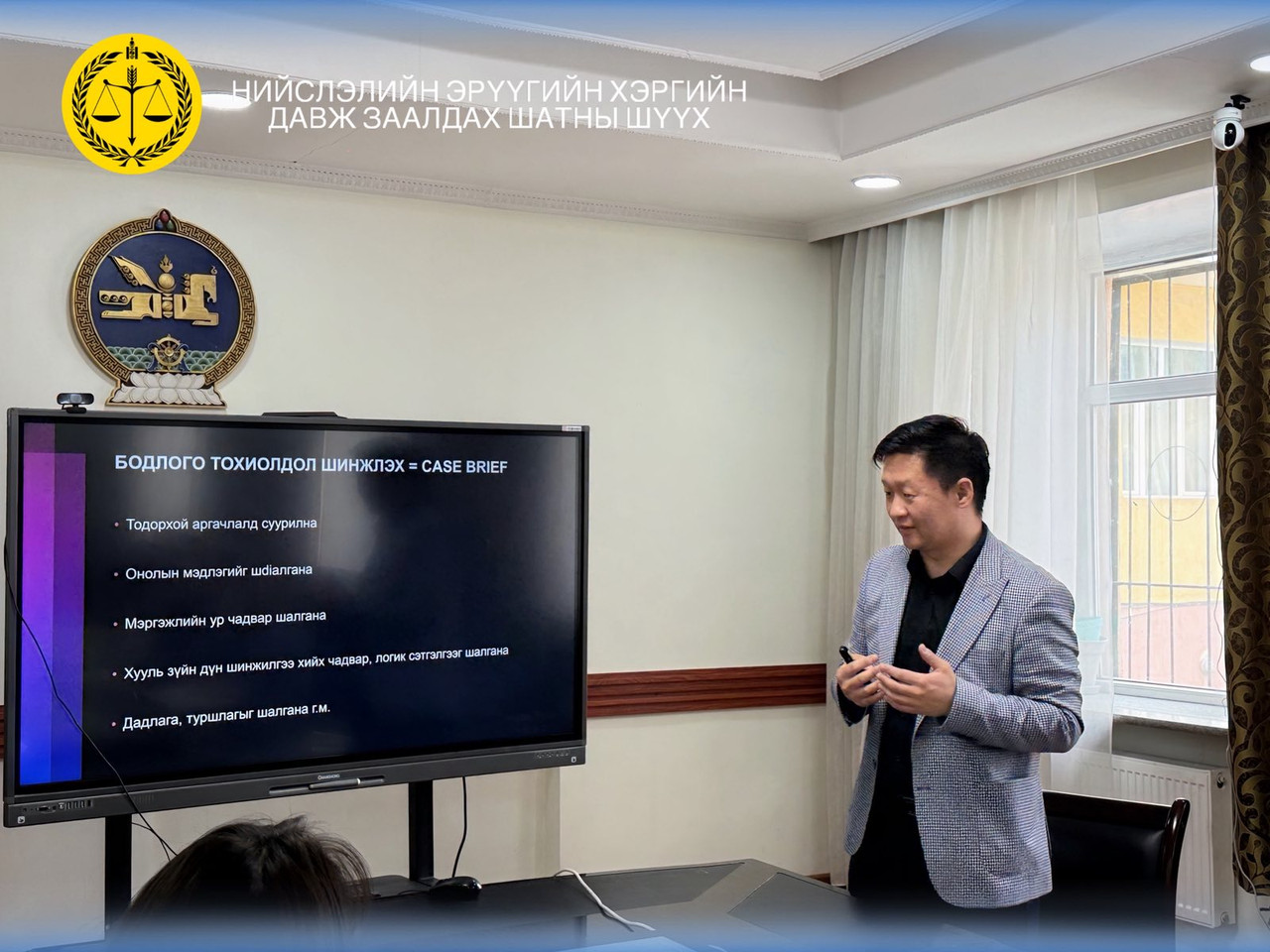 Сургалтыг Нийслэлийн Эрүүгийн хэргийн давж заалдах шатны шүүхийн шүүгч Л.Галбадар удирдан явуулж, эрүүгийн эрх зүйн тохиолдол шинжлэх аргачлалын хүрээнд хууль хэрэглээ, хэргийн зүйлчлэл, шүүхийн практикийн талаар дэлгэрэнгүй мэдээлэл өгч, харилцан ярилцсан үр дүнтэй сургалт боллоо.